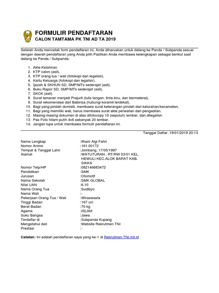 Doc Berkas Persyaratan Tni Ad Arina Wahyu Academia Edu from 0.academia-photos.com Segera daftarkan diri anda, negara dan bangsa menunggu darma baktimu. Dokumen surat lamaran doc & pdf. Berikut contoh surat lamaran pekerjaan yang bisa kamu download file dokumennya juga, link di bagian akhir artikel. Tahapan tes untuk menjadi prajurit tni au. Donwload fille surat lamaran prajurit tni ad tamtama / contoh surat lamaran menjadi prajurit tamtama tni ad kumpulan contoh gambar. Namun, penerimaan ini hanya berlaku untuk wilayah kodim 0315/bintan, kodim 0317/tanjung balai karimun dan. Savesave surat lamaran.docx for later. Tni ad membuka rekrutmen pada 2020 dengan kuota 17.264 prajurit.